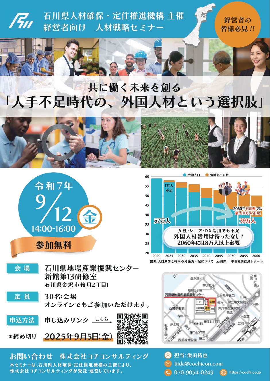 当セミナーは、外国人労働者採用に向けた企業の意識改革を目的としたもので、弊社提携会社である株式会社コチコンサルティングが当セミナー事業を石川県より受託されました。